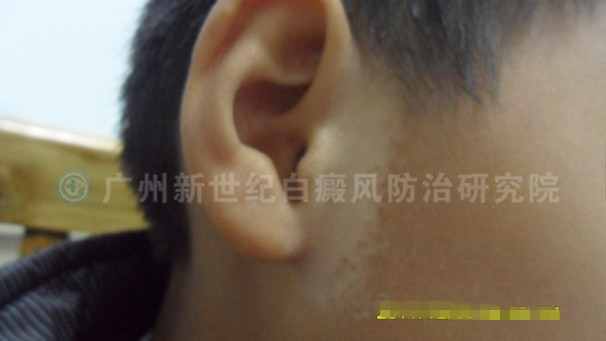 ▲病史:患者于1年前无明显诱因发现双面颊、双耳前部出现片状白斑,曾多次用过外用药治疗,但是效果不佳,且白斑部位不断在扩散,患者的母亲恐其继续发展,故今日特来我院就诊。