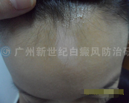 ▲病史:患者患白癜风有2个多月的时间。刚开始只是前额正中出现星点状白点,现白斑已发展成钱币大小,黑色素已经脱失78%左右,致使前额的白癜风患处的汗毛已变成白色。之前尝试过口服、外用药,效果不佳。特来我院接受治疗,并成功。