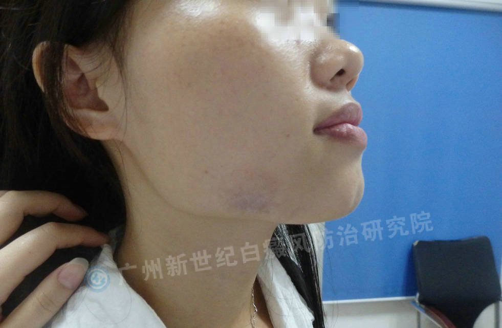(陈女士初诊时右下颌处白斑症状)