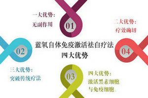 “蓝氧自体免疫激活祛白疗法”属于新一代白癜风治疗方法的先进技术,其通过细胞学和免疫学研究,对人体DNA、RNA直接作用,解决了传统疗法的疗程、复发等问题,对不同病因、不同病症采取个性化治疗方案,使治疗更具针对性,有效提高临床率。其主要优势表现在四大优势上。
