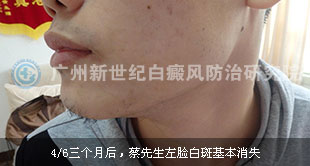 一段时间过后,脸上的白斑不但没消失,反而扩散了,给蔡先生的日常生活产生了很大的影响,今年26岁的他还没女朋友,就是因为数次相亲时都因为脸上的白斑而遭到了对方的拒绝。在同事的介绍下,才来到广州新世纪白癜风防治研究院进行治疗。